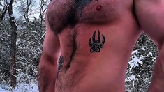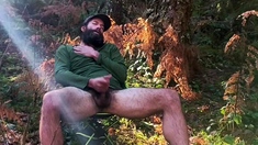 Ripped viking playing with himself outside in nature