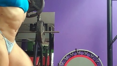 Tanned blonde babe in bikini masturbating under shower